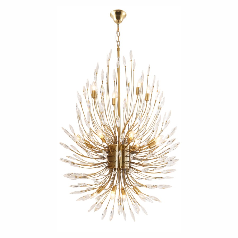Este lustre chama atenção com seu visual escultural e sofisticado, que remete ao formato de uma explosão luminosa ou flor em pleno desabrochar. A estrutura metálica dourada se expande em hastes curvas, cada uma adornada com cristais K9 clear lapidados, criando um efeito visual deslumbrante e tridimensional. O conjunto é finalizado com 16 soquetes elegantemente distribuídos entre os cristais.
