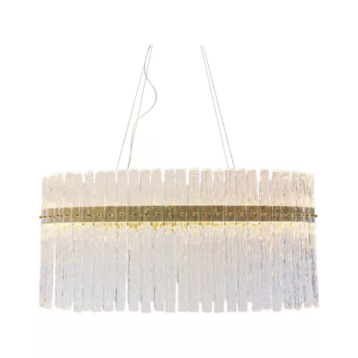 Com uma presença marcante e elegante, o pendente Freddo combina elementos clássicos e contemporâneos em um visual imponente. A estrutura em formato oval é composta por delicadas hastes de vidro transparente com textura orgânica, que criam um efeito visual semelhante ao gelo. A faixa metálica dourada central adiciona um toque de luxo e sofisticação, equilibrando modernidade com requinte.